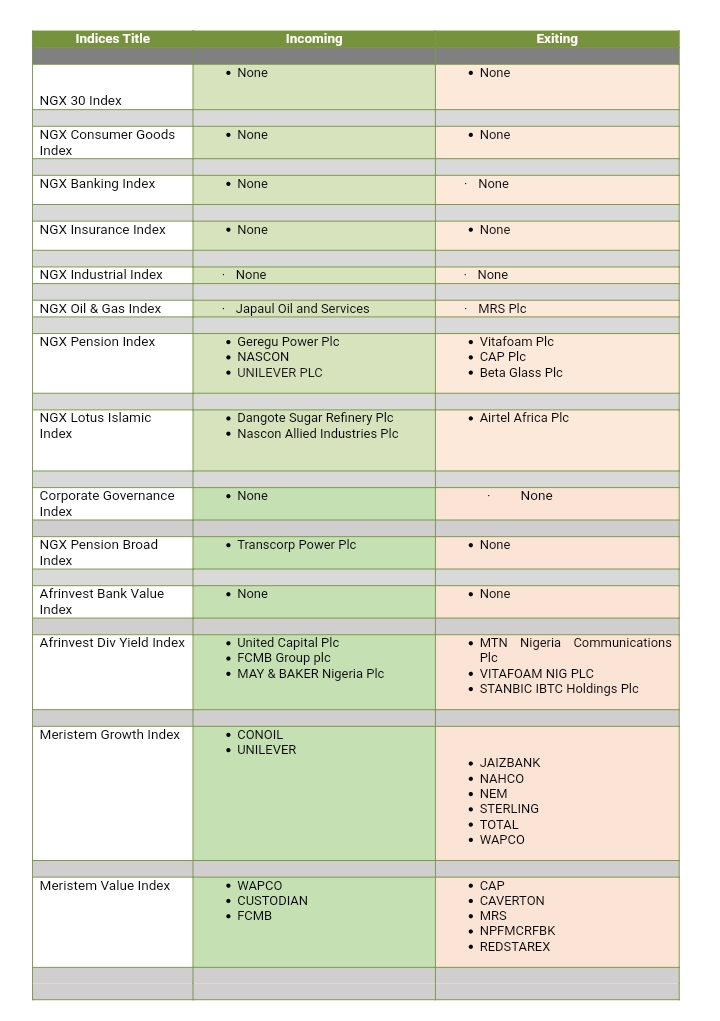 Nigerian Exchange Limited (NGX) has released the results of its full year market index review for the following indices – NGX 30; NGX Lotus Islamic; NGX Pension; NGX Pension Broad Index; Corporate Governance Index; Afrinvest Bank Value Index; Afrinvest Dividend Yield Index; Meristem Growth Index; Meristem Value Index; and the five Sectoral Indices of The Exchange – NGX Banking, NGX Insurance, NGX Industrial, NGX Consumer Goods and NGX Oil & Gas.